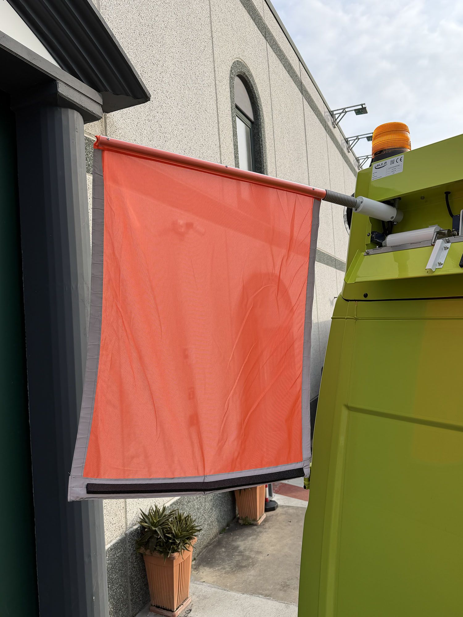 Il sistema automatizza le fasi di apertura, estensione e sbandieramento, eliminando l’intervento diretto dell’operatore e garantendo una segnalazione chiara, costante e visibile, anche in condizioni meteorologiche avverse.